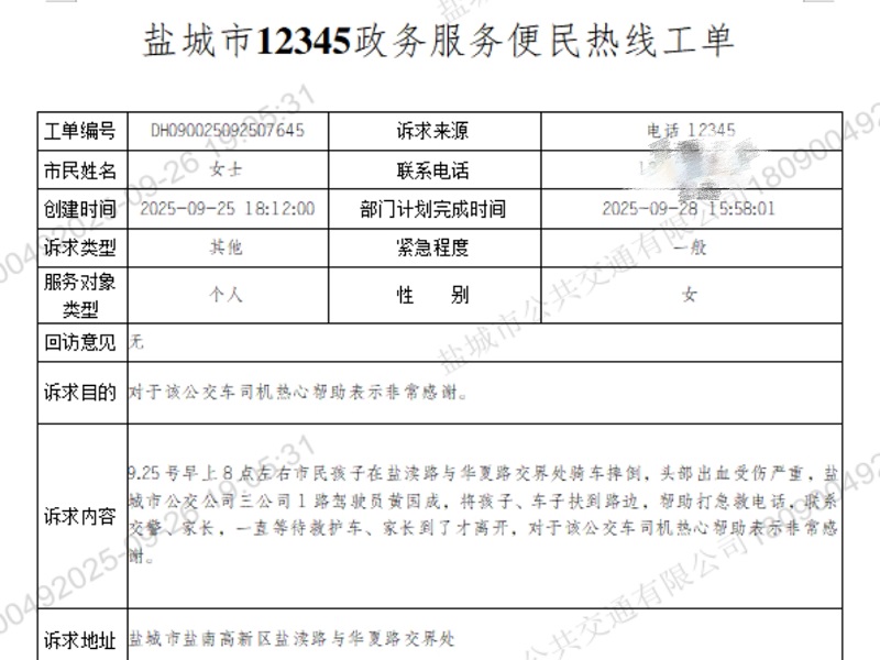 9月27日,市公交公司收到12345熱線轉(zhuǎn)來(lái)的一則表?yè)P(yáng)工單,市民董女士對(duì)1路公交車駕駛員黃國(guó)成在雨中攙扶其孩子上車避險(xiǎn)并實(shí)施緊急救助的暖心善舉給予了高度贊揚(yáng)。