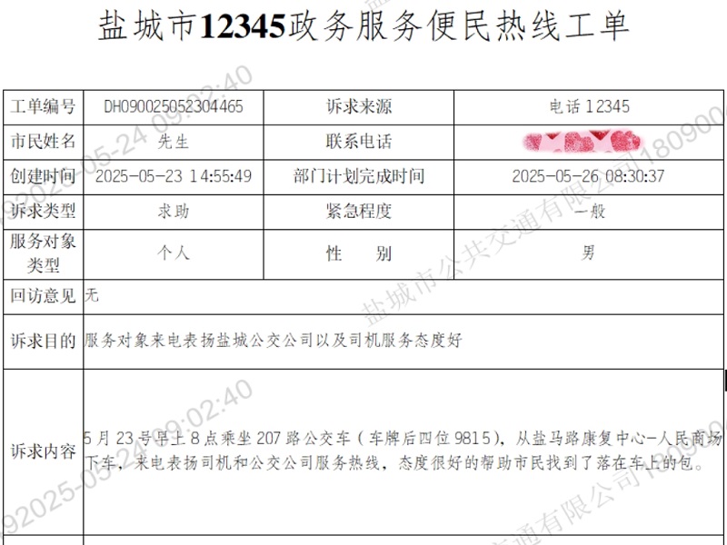 三分公司后臺工作人員柏春艷迅速響應(yīng),根據(jù)陳先生提供的信息,排查當日班次,鎖定了他所乘坐的蘇J09815D號車,此時駕駛員張超正準備發(fā)車。考慮到陳先生上班時間臨近,柏春艷提議讓張超將手提包帶至康復(fù)中心站臺歸還。13時26分許,車輛駛?cè)爰s定站臺,陳先生順利取回手提包,對張超的拾金不昧和柏春艷的熱情服務(wù)表示衷心感謝,并撥打“12345”熱線進行表揚,于是有了這份特別的“表揚工單”。