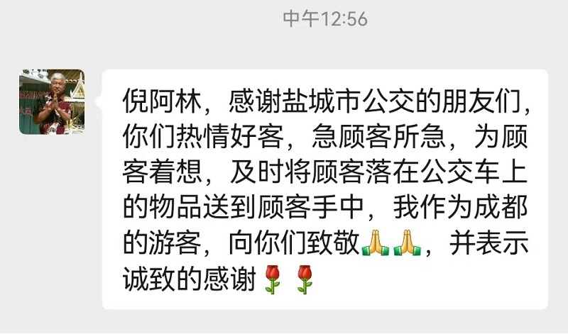 “我不是鹽城人,能否麻煩你們司機幫我找個‘跑腿’,將我的背包送到澤一方賓館……”考慮到譚老先生人生地不熟,為了盡快將背包物歸原主,倪阿林果斷決定,下班后親自駕車將背包送至其所住的賓館。事后,順利取回背包的譚老先生用真摯的文字深情表達了對倪阿林的感激之情。