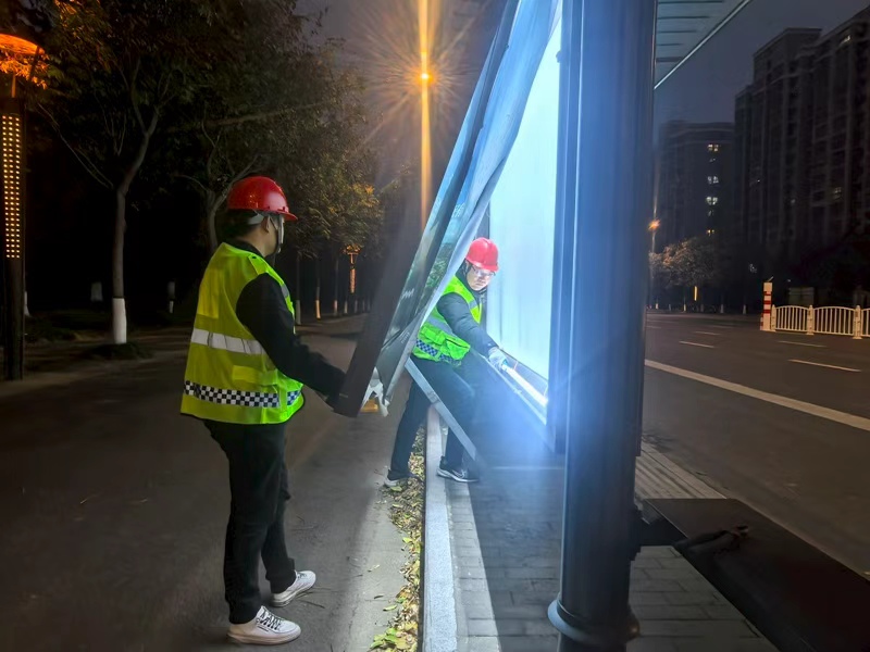 作業(yè)期間,維修隊(duì)員日夜輪轉(zhuǎn)、分工有序。白天,他們對(duì)站牌、座椅等進(jìn)行打磨、補(bǔ)漆,恢復(fù)標(biāo)識(shí)清晰度;夜晚,他們借助照明設(shè)備逐一排查燈箱線路,更換損壞光源,加固松動(dòng)部件。低溫環(huán)境下,盡管隊(duì)員們呼出的白氣凝結(jié)成霜,但手中的工具卻始終穩(wěn)定而有力。