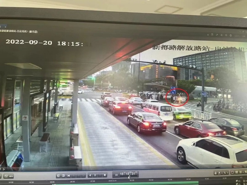 此時,新都路解放路BRT站臺當(dāng)班站務(wù)員付鶴麗正在對站臺進(jìn)行日常巡查,突然聽到一位正在站臺等車的乘客大聲叫喊起來:“那邊有電瓶車著火了!”順著乘客指著的方向,付鶴麗看到馬路對面一輛電瓶車冒出濃煙滾滾。見狀,付鶴麗一邊電話向公司報告情況,一邊快速跑到站房拿起滅火器,沖向著火的電瓶車。